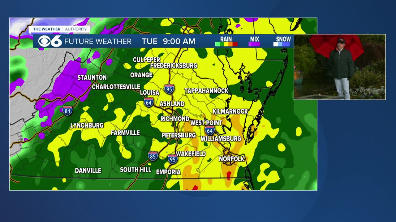 The precipitation should begin in the Richmond-area around 4 a.m. Tuesday and should end around 1 p.m. Tuesday.