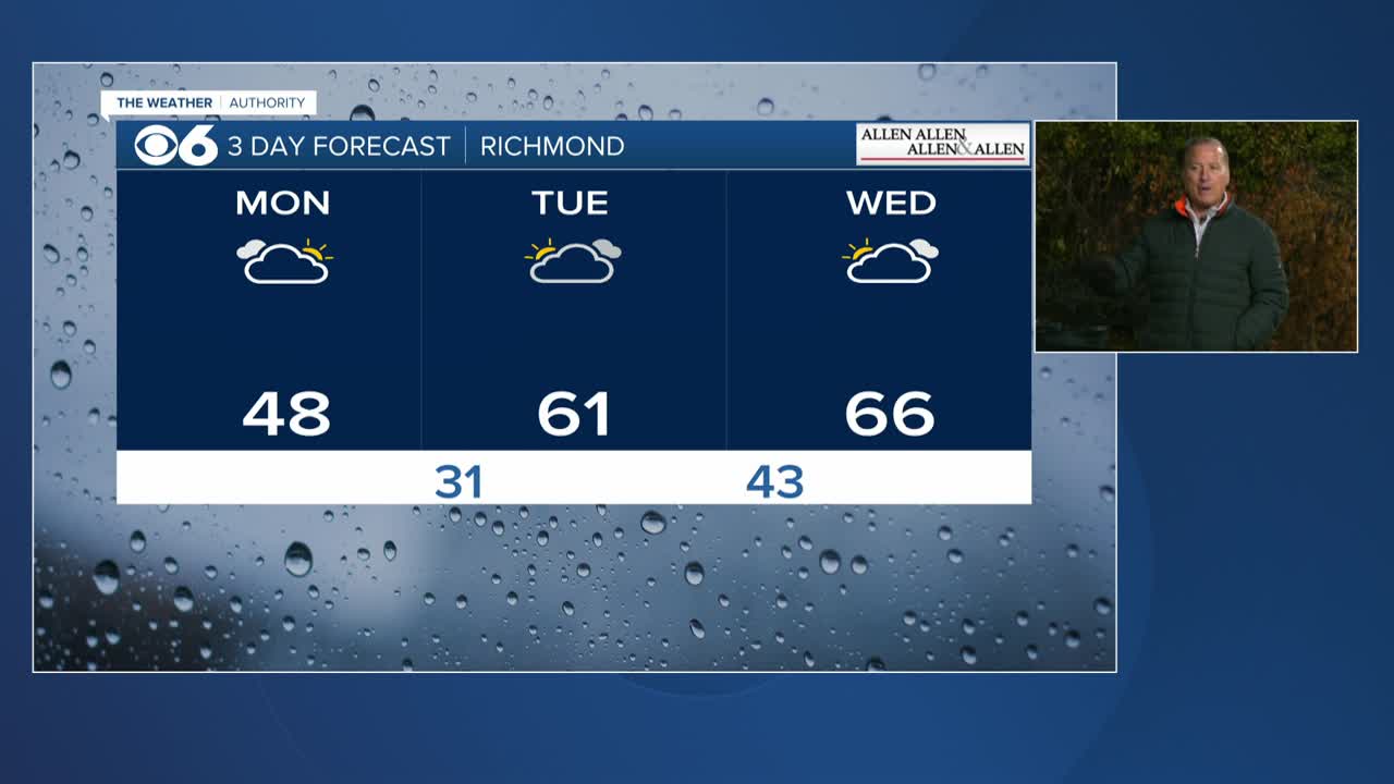 RICHMOND, Va. -- The clouds will be stubborn Monday morning, but should break for sun from west to east during the afternoon. A chilly north breeze will keep temperatures mostly in the 40s.