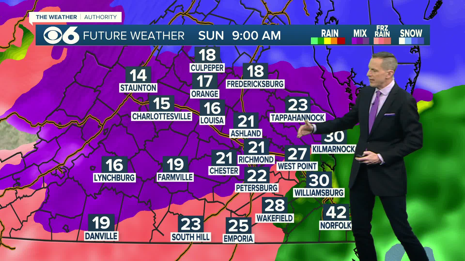 TODAY: Snow changing over to sleet (ice pellets). Sleet will change to freezing rain from southeast to northwest. Highs in the 20s to lower 30s. Some warmer air in eastern and southeastern Virginia will allow for highs to get above freezing, changing coastal areas over to plain (non-freezing) rain. A little breezy with wind chills in the single digits and teens.