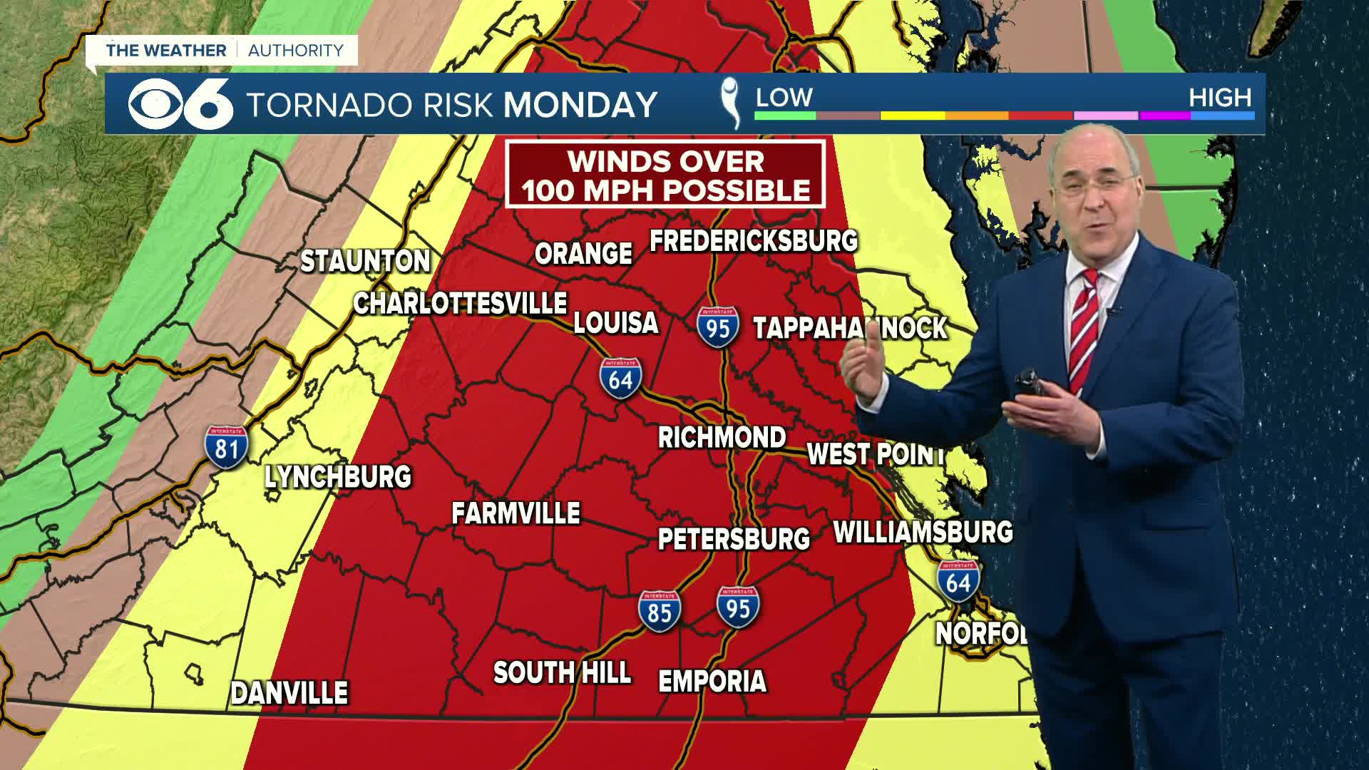 There is a risk of multiple tornadoes, some of which could produce winds over 100 mph. Due to the dynamics in place, these could be "long track" tornadoes, meaning they would stay on the ground for an extended period of time.