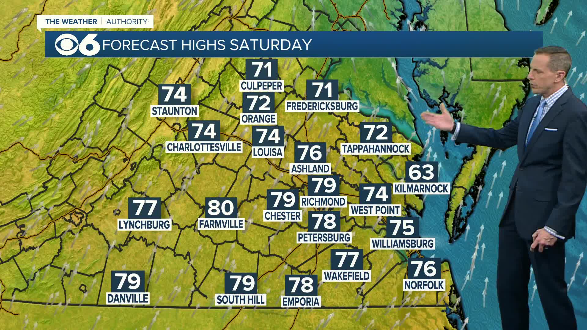 The front will shift northeastward a bit on Saturday, allowing many areas to hit 75-80 across central Virginia. It will be cooler near the coast.
