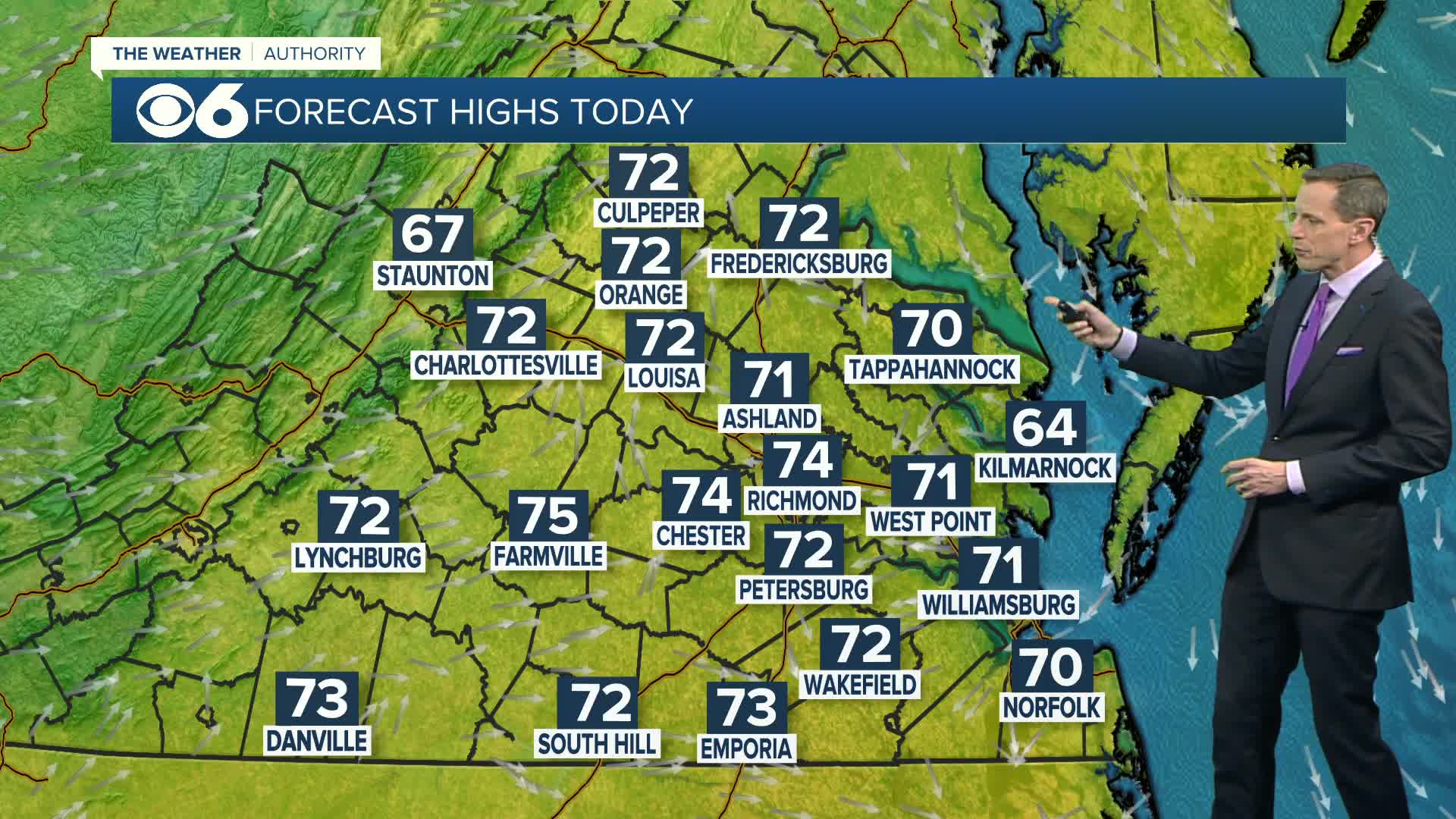 RICHMOND, Va. -- We will have lots of sunshine for much of today. Some clouds will increase at times this afternoon. Highs will be in the low to mid 70s away from the coast.