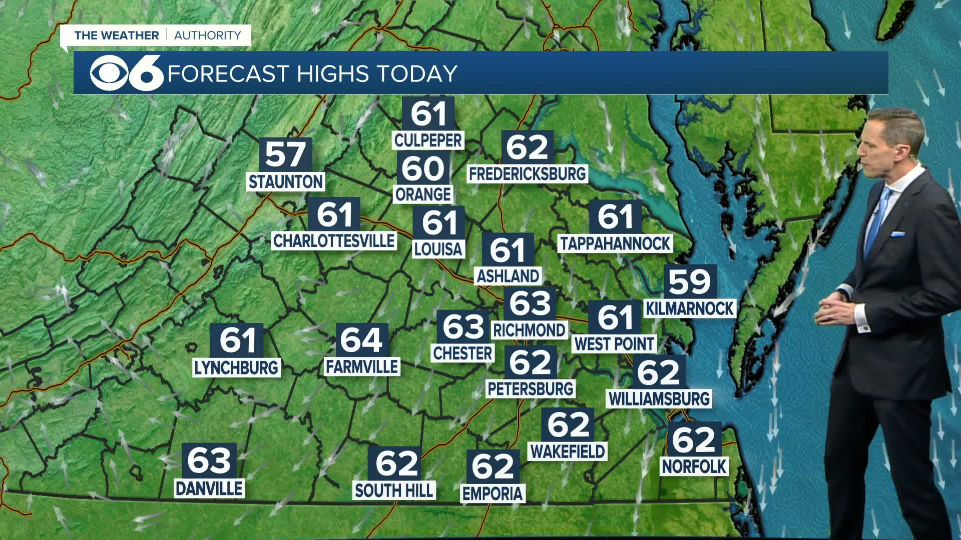 A storm system will pass to our south Monday into Tuesday. The bulk of the heavy rain will stay south of Virginia, but a few showers are possible, mostly well south of I-64. Highs will be in the 50s to around 60.