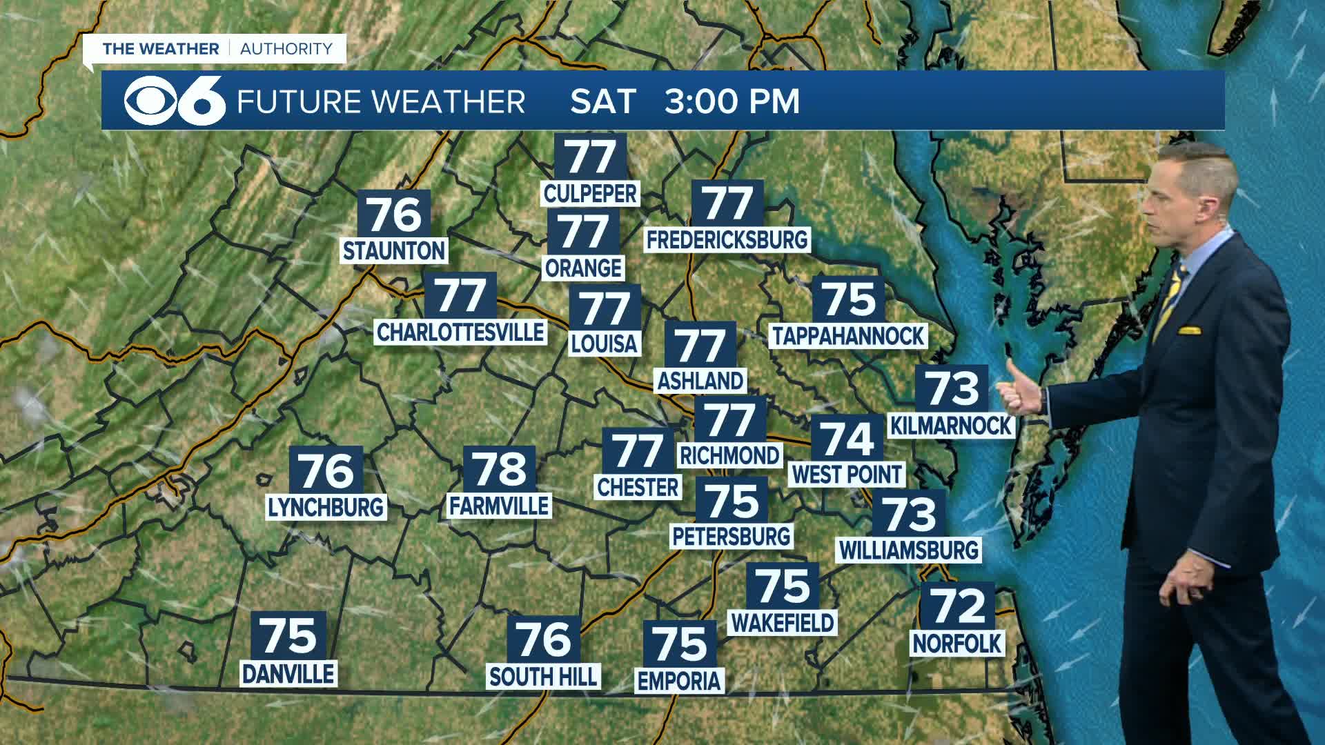 Sunday will be sunny with highs in the upper 70s to lower 80s.